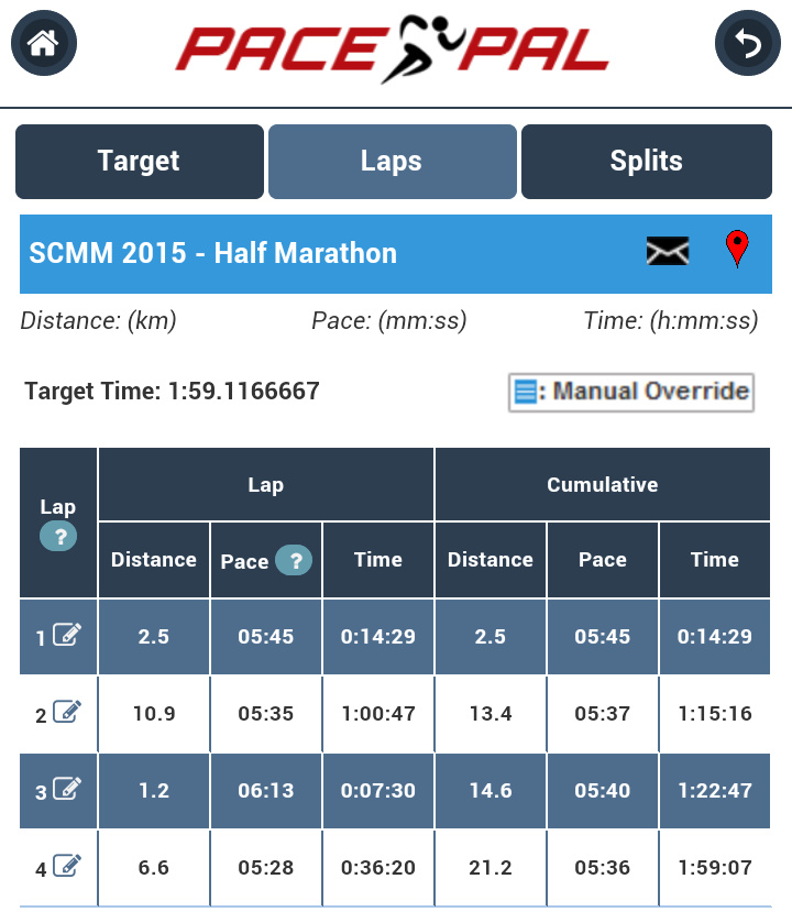 Looking at the splits for the natural laps we see directly from PacePal the various cumulative times.