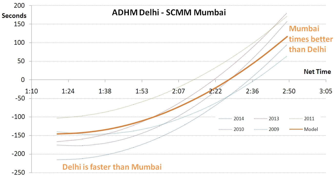 There is no single “Delhi is faster than Mumbai by X minutes” that paints a decent representation. In fact the slower runners in Delhi get faster by the time they race in Mumbai.
