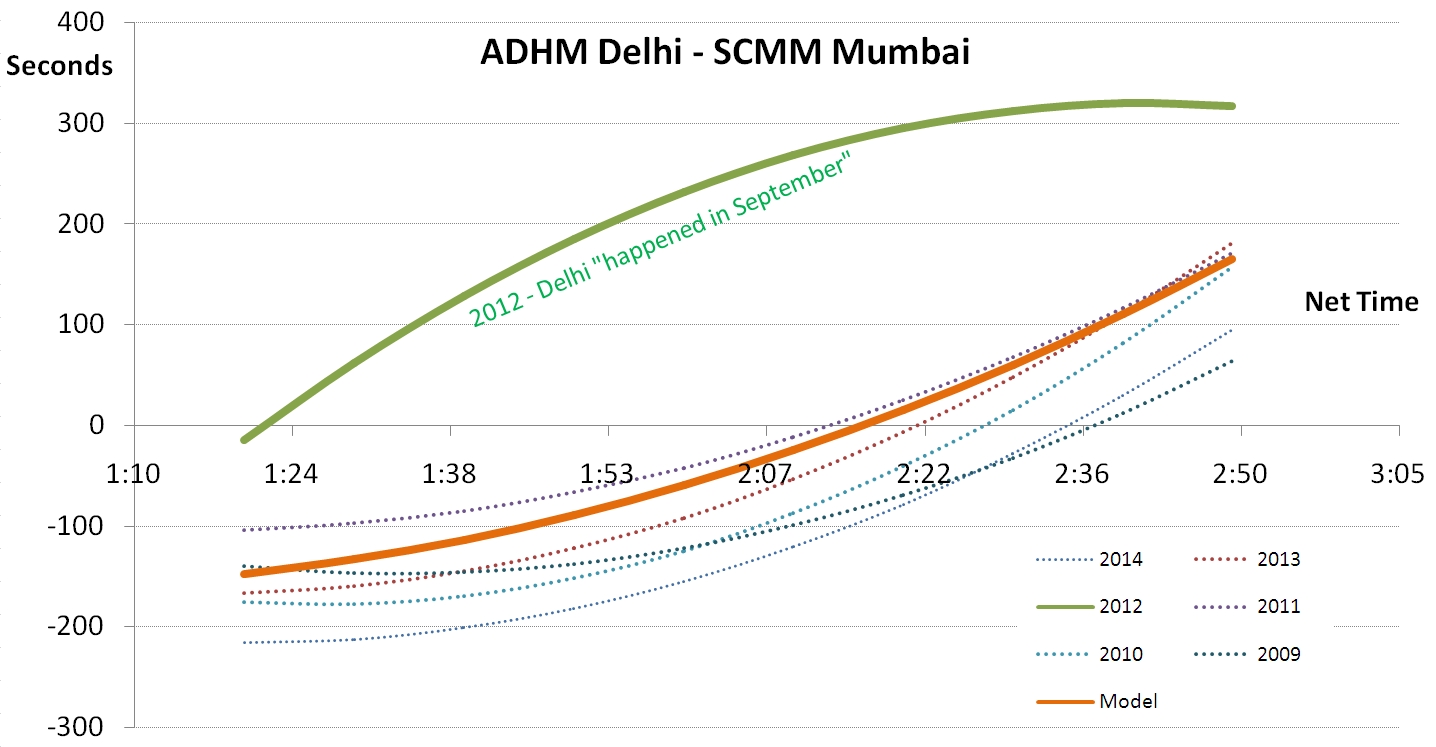 brilliant analysis.. Personally I am one of the runners who did ADHM 2012 as my debut race and then did SCMM 2013. Clocked 02:34 and 02:27 respectively. consistent with your findings about the weather factor and a beginner factor making SCMM a faster race for me. To add to it 8 months later in August 2013 I did the AHM 2013. A much tougher race and i clocked 2:25. This because of the initial drastic improvement with training!