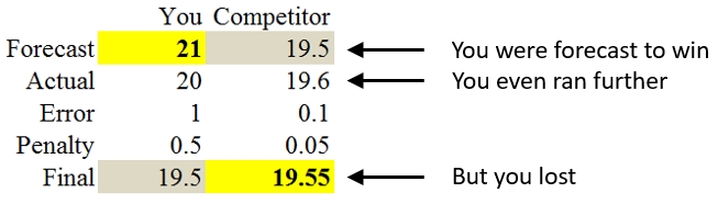 The penalty rule – Whatever be the difference between your forecast and what you actually run is your error distance (positive or negative). Whether you run more or less than your forecast, half of the error distance is subtracted from what you actually run. So, running less than or more than your forecast distance is an inefficiency. We don’t like penalties, and we don’t like inefficiencies, oh no, we don’t! (Why you need not run!)
