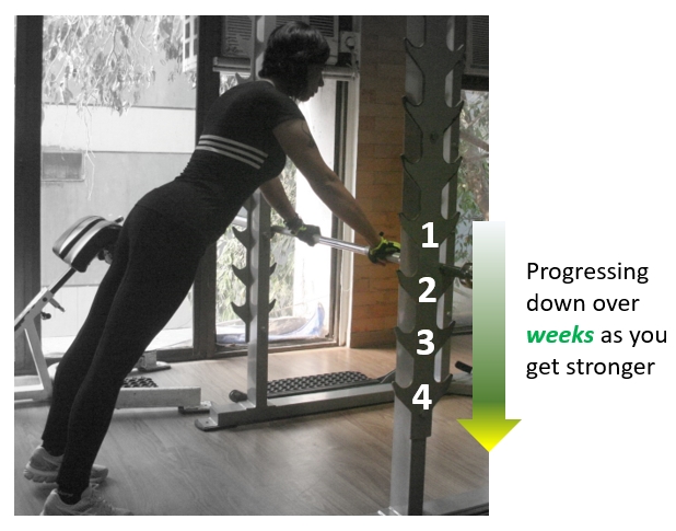 Whether you are trying to correct your form or attempting to do your first pushup properly, it’s best to reduce the load being lifted by starting off with what I call “assisted pushups”. You do not need any special equipment for this. Simply find a horizontal raised surface for your hands e.g. kitchen counter or the trunk of your car! If at the gym, you can use a squat rack and its barbell rod. (Have a look at Mrs Arora in the photos below.) The key point to note here is that if your feet remain on the ground and your hands are placed on a surface above ground level, the resistant force to work against is lower. To understand this clearly, picture yourself standing straight against a wall and pushing against it – almost zero effort, super easy! But we don’t need it that easy. With the hand positioned sufficiently high, it should be possible for you to execute a good quality pushup and feel the effort of doing so. Remember, your nose now needs to go down to the level of an imaginary sloping floor that runs from your toes to your hands.