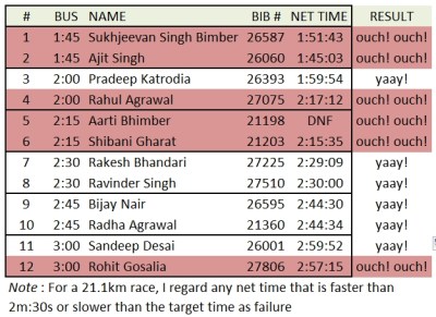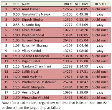 Most mass participation sporting events are about combining physical fitness with entertainment. In India with all its frustrations of corruption in so many walks of life, we often look at recreational running as a way to get away from things that we often seem to have little control over, towards something that we can have some control over that also leads to a better physical existence. So, when we race towards a time target with a pacer, we expect that promises will not be broken, just like that of politicians. We expect that we won’t get failure, just like that of electricity supply. We hope that we won’t fall short of our target like we might fall short of water in our homes. 7 pacers out of 12 failing to achieve their promised target for the half marathon is shocking!