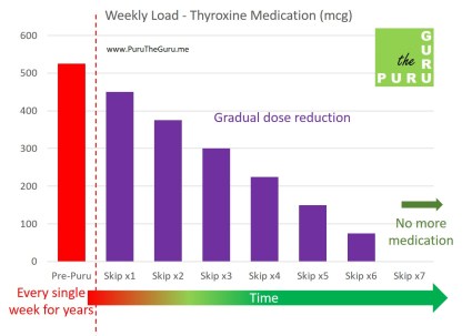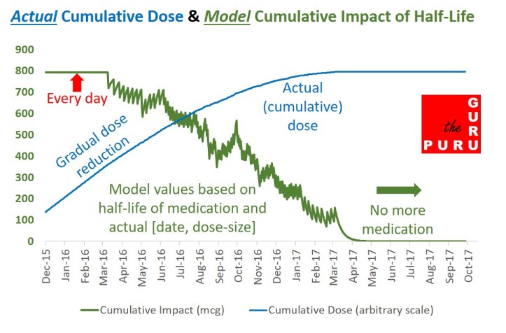 Our plan was to reduce her weekly total dosage in steps, holding each level fixed for 8 weeks, before going to the next (lower) level. We did this by ‘skipping days’ rather than reducing the daily dosage. Skipping days was a protocol possible because of the half-life of the medication being many days, rather than a few hours. The idea was to train the thyroid pathways of her endocrine system to function better while giving the body enough time to adjust to the new levels of external medication. A quick internet browse will give you a long list of side-effects of the medication that a typical hypothyroid patient is on. We were also aware that removing such medication too quickly might have additional or different negative effects.