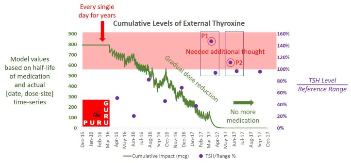 During the period, there was no need to increase the total weekly dose. Of specific interest to us was scheduled readings P1 and P2 (labelled in the graphic). These were ‘slightly above the normal range’. Immediately prior to those scheduled times Mrs T had been through numerous changes in her environment. These included global travel, with drastic weather variations, sizable time zone changes, changes in diet, and noticeably higher business/family stress. In both cases, P1 and P2 , the readings were repeated after a few days of settling back into her ‘normal and relaxed’ lifestyle. They were then ‘within range’. [Read: Interpretation of Thyroid Function Tests, Lancet (2001)]