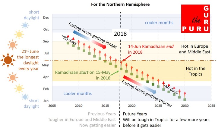 Every year the month of Ramadhaan arrives about 10 or 11 days earlier in the Gregorian calendar. In 2015, 2016 and 2017, the month of Ramadhaan included 21st June, the longest day in the Northern Hemisphere. This year, 2018, the month of fasting will end about a week before that date and will include it again only in 2049. For countries like India, Pakistan and Bangladesh that experience their hottest months from March-June, the next 8-9 years are going to be tougher Ramadhaans from a “fasting with hot weather conditions” perspective. As we go further north of the tropics to, say, Europe, the fasting has already become easier compared with the years 2010-2015 when Muslims in Europe were fasting in the peak of their summer, July-August.