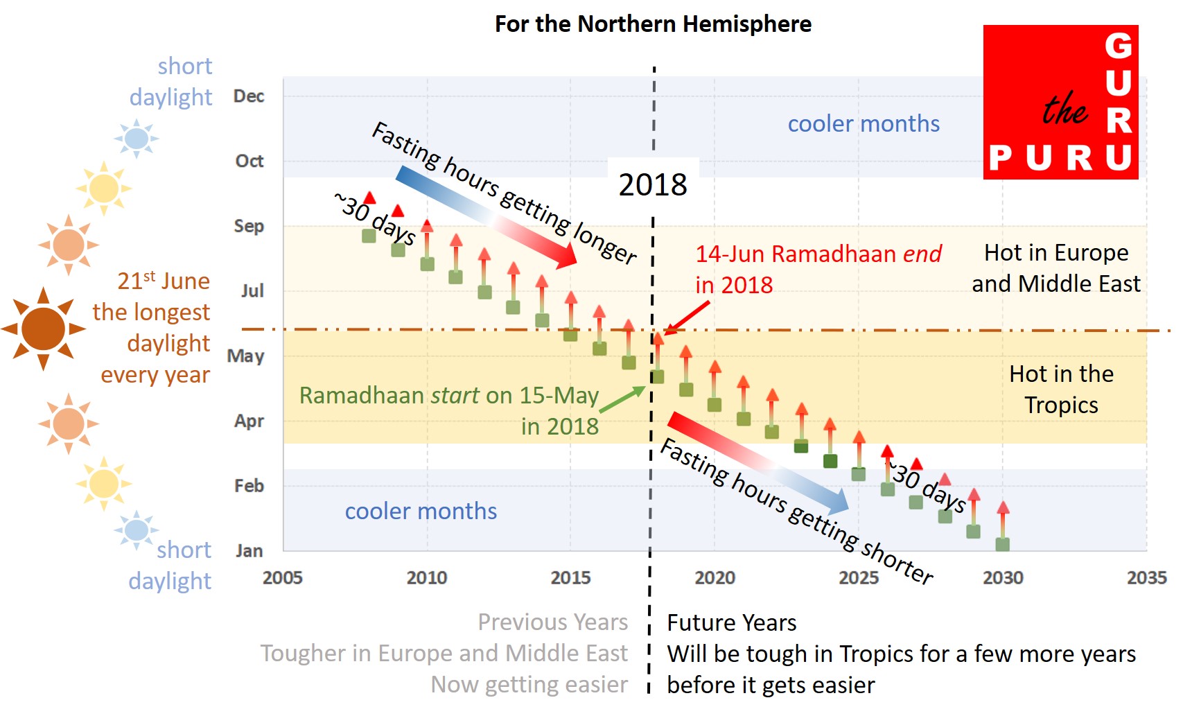 Every year the month of Ramadhaan arrives about 10 or 11 days earlier in the Gregorian calendar. In 2015, 2016 and 2017, the month of Ramadhaan included 21st June, the longest day in the Northern Hemisphere. This year, 2018, the month of fasting will end about a week before that date and will include it again only in 2049. For countries like India, Pakistan and Bangladesh that experience their hottest months from March-June, the next 8-9 years are going to be tougher Ramadhaans from a “fasting with hot weather conditions” perspective. As we go further north of the tropics to, say, Europe, the fasting has already become easier compared with the years 2010-2015 when Muslims in Europe were fasting in the peak of their summer, July-August.