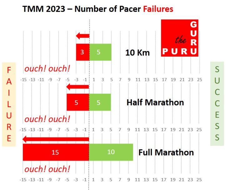 The graph above showing the number of pacing failures in each race event gives us a clear message – in aggregate, the results are dismal. Ideally, we should have seen only green and no red. Ouch, ouch!