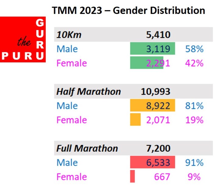 I won’t discuss the myriad ways to encourage more women to use recreational distance running for better health. Instead, I present the gender-wise split of participants in the 3 races. It is only FYI – we cannot draw any firm conclusions about why there are fewer women in the longer races. I cannot even say they are wiser because they may not have chosen to run less out of wisdom.
