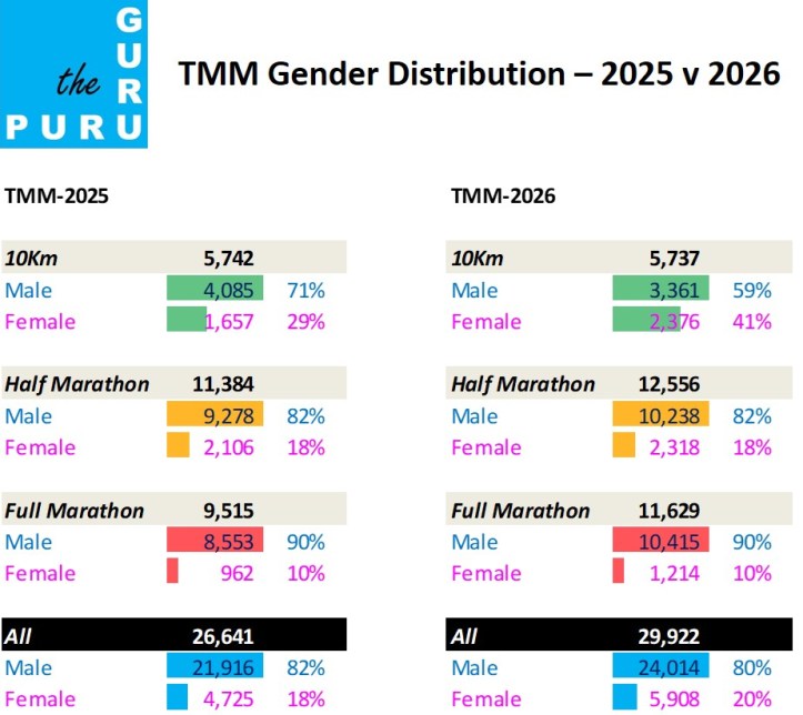 I won’t discuss the various ways that all of us can empower more women to take advantage of recreational distance running for better health. Instead, I present the gender-wise split of participants in the 3 races for this year (2026) and last year (2025). It is only FYI – we cannot draw any firm conclusions about something that is multifactorial. What I will say is that you do not have to run very long distances to be fitter. And, I can also say that you do not need to run (to be fit).