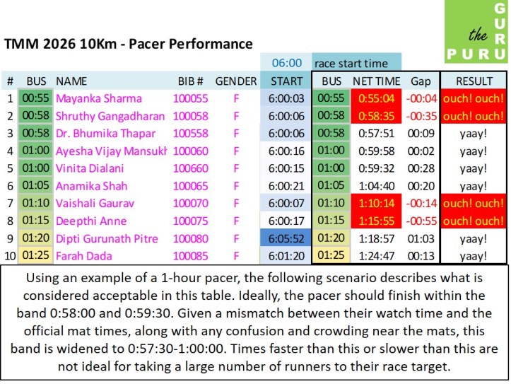 Any pacer with a “Gap” of less than 30 seconds should be careful to finish a little bit faster next time. Although they received a yaay! there is a distinct possibility that a participant who started off a few metres ahead of them in the crowd and finished a few metres behind them will have missed the target by a few seconds.